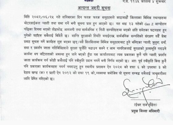 काठमांडू, 10 अक्टूबर (हि.स.)। काठमांडू जिला प्रशासन ने राजधानी में किसी भी प्रकार के राजनीतिक सभा, सम्मेलन, विरोध, प्रदर्शन और…