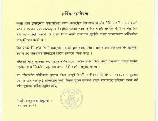 ईरानी हमले में यूएई में मारे गए नेपाली नागरिक की पहचान हुई, पार्थिव शरीर जल्द स्वदेश लाने की तैयारी