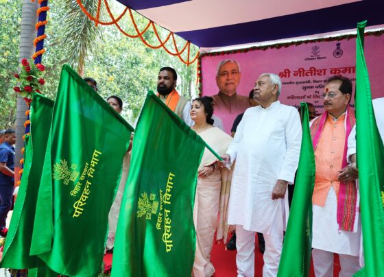 मुख्यमंत्री नीतीश कुमार महिलाओं के यात्रा के लिए २० पिंक बस को झंडी दिखाकर रवाना करते