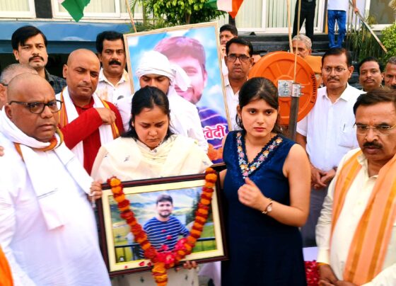 कानपुर में शुभम द्विवेदी की पत्नी एशन्या ने बहुत ही भावुक होकर अपने दिवंगत पति शुभम द्विवेदी के चित्र पर माल्यार्पण कर नमन किया का छायाचित्र